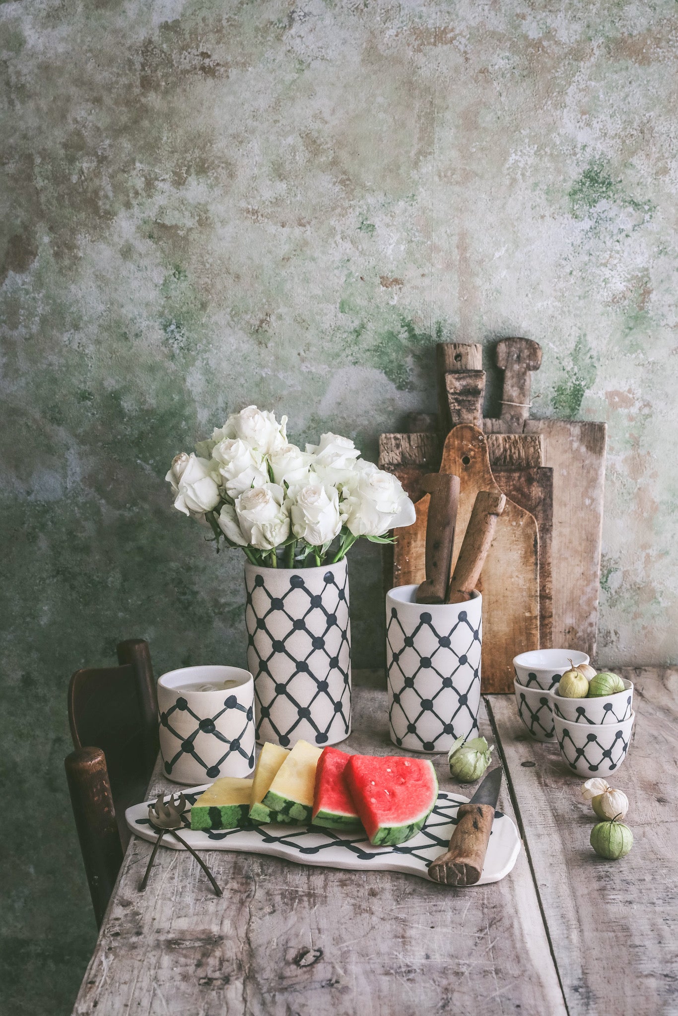 Each piece is hand thrown on the wheel and hand painted with the keffiyeh pattern. Each piece is one of a kind.